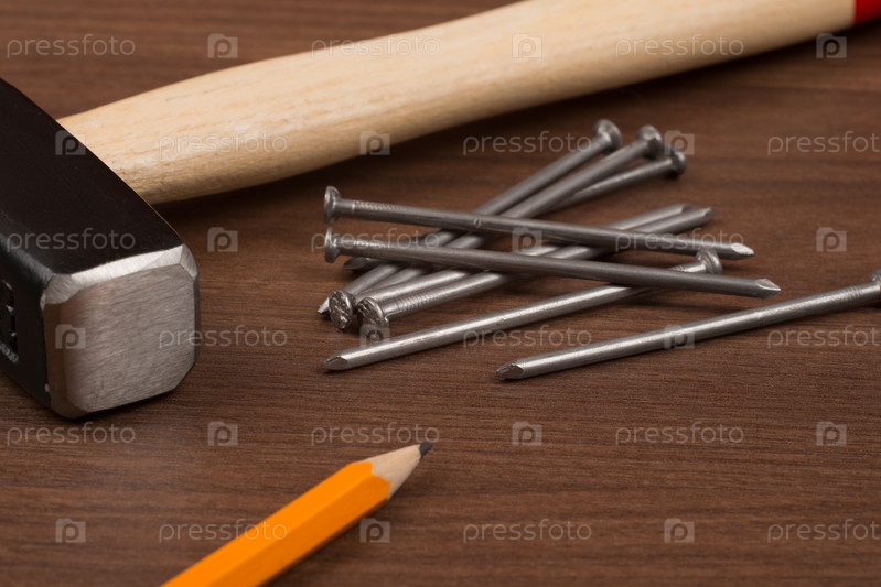 Молоток и гвозди на столе