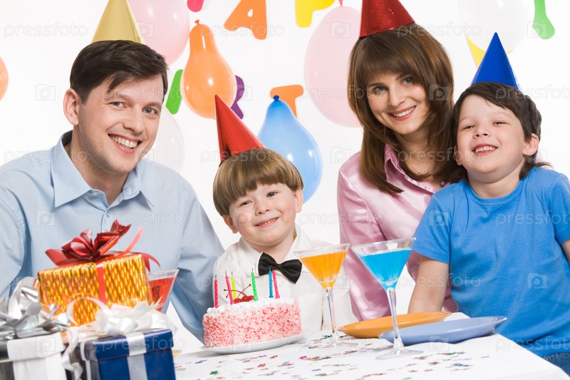 Портрет счастливого мальчика, проводящего свой день рождения с родителями и старшим братом поблизости