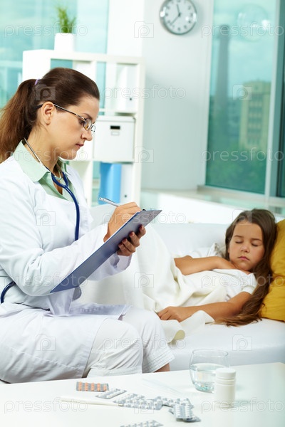 Врач выписывает рецепт, сидя у кровати больного