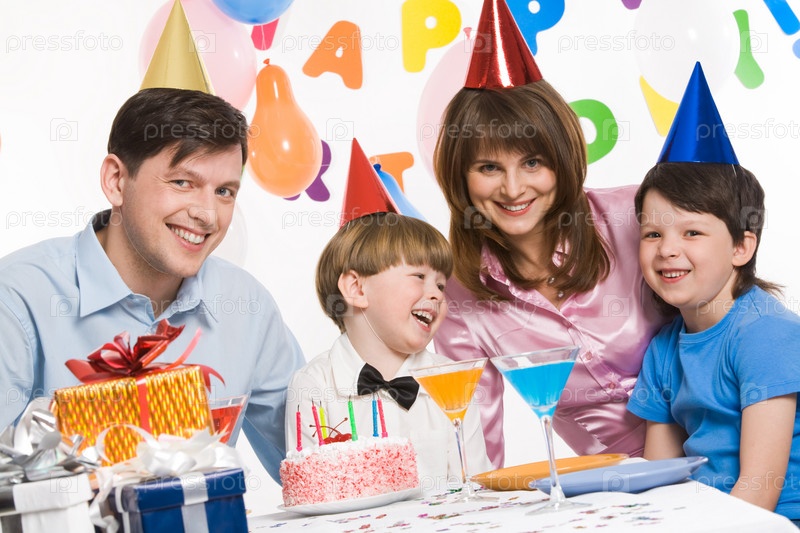 Портрет счастливых мальчиков и их родителей, веселящихся на день рождения