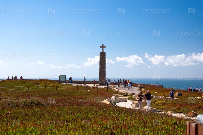 Туристы осматривают каменный крест на морском берегу