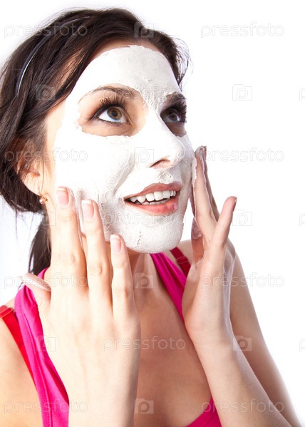 Портрет молодой девушки с косметической маской на лице на белом фоне