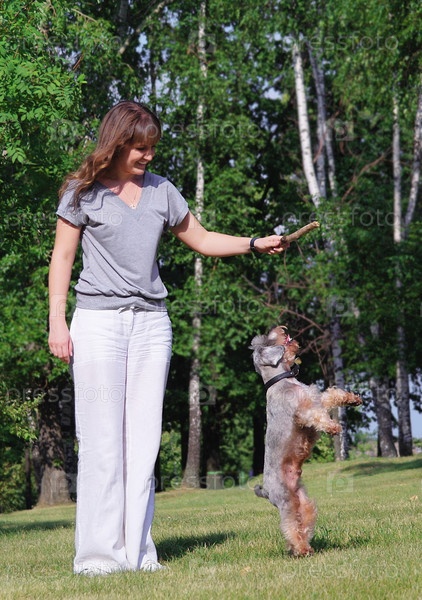Женщина играет с собакой породы "цвергшнауцер" в парке