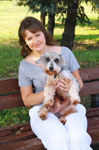 Женщина с собакой породы "цвергшнауцер" на скамейке в парке