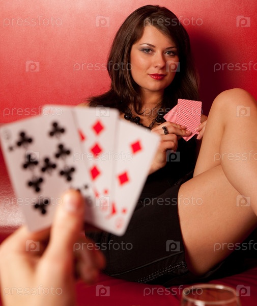 Портрет молодой девушки, играющей в карты на красном фоне