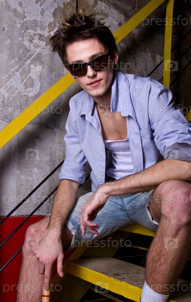 Портрет молодого парня, сидящего на лестнице