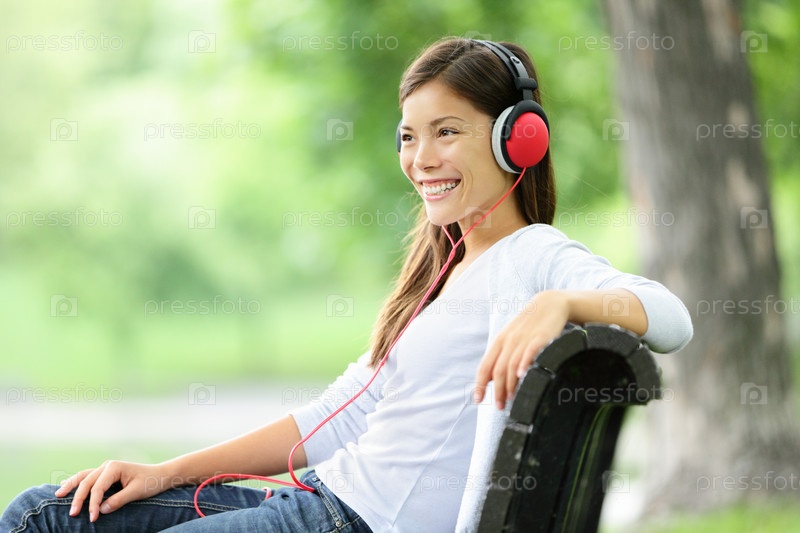 Женщина слушает музыку в парке