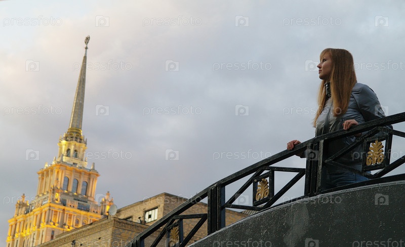 Девушка стоит на мосту и смотрит на закат на фоне освещенного солнцем здания, Москва