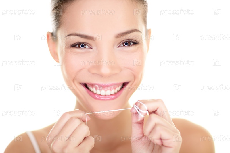 Женщина чистит зубы зубной нитью