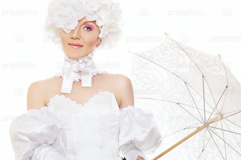 Женщина в белом платье, с цветами на голове и с кружевным зонтом, фэшн-съемка