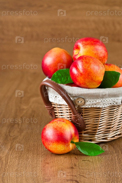 Свежие фрукты нектарины в корзине на деревянном фоне