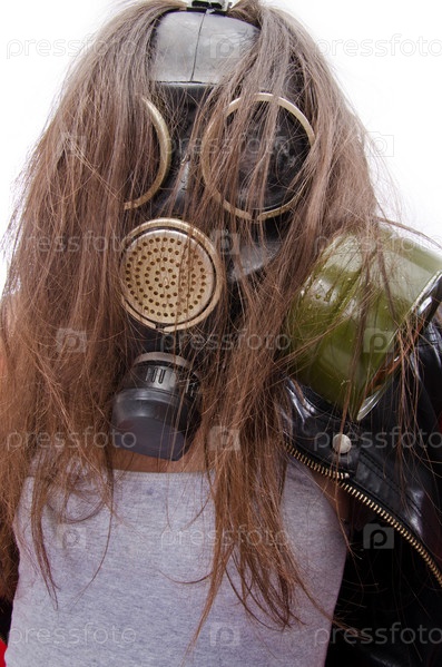 Женщина с длинными волосами в противогазе