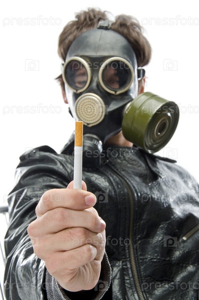 Портрет мужчины в противогазе, протягивающего сигарету
