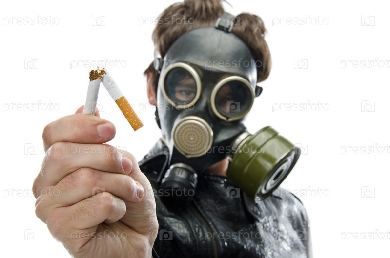 Портрет мужчины в противогазе, со сломанной сигаретой в руке