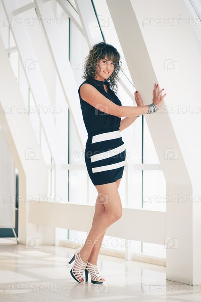 Стройная девушка в платье позирует в белом помещении