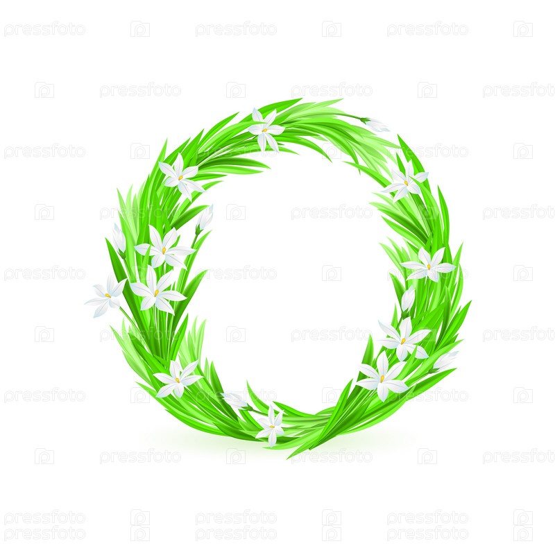 Буква О из зеленой травы и цветов на белом фоне