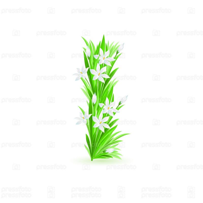 Буква I из зеленой травы и цветов на белом фоне