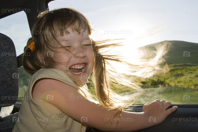 Маленькая веселая девочка сидит в машине возле открытого окна