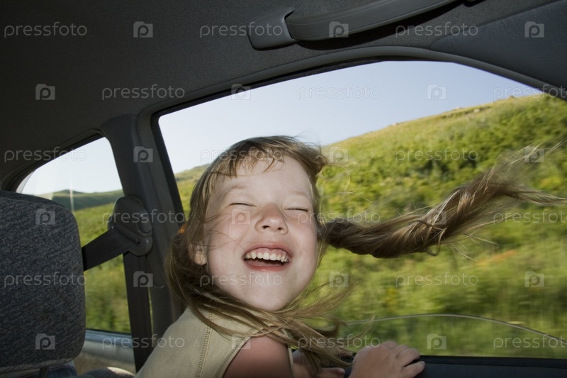 Маленькая веселая девочка сидит в машине возле открытого окна