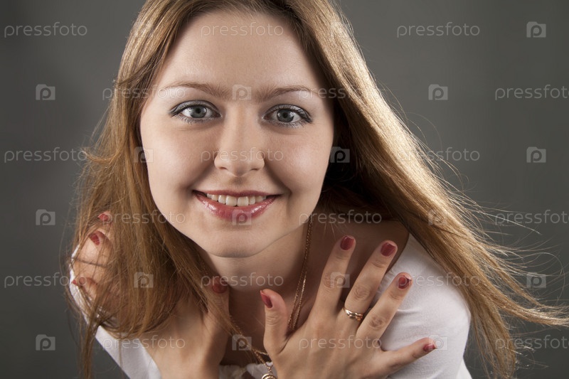 Веселая женщина с длинными волосами на сером фоне