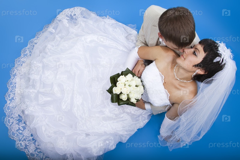 Молодые жених и невеста на синем фоне