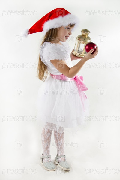 Веселая маленькая девочка в новогодней шапке держит фонарь