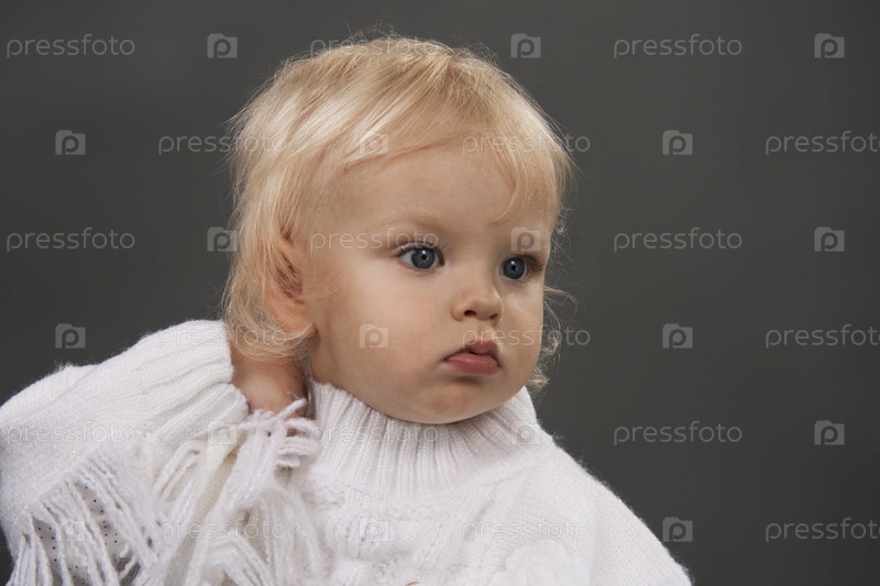 Маленькая девочка в белой кофте на сером фоне