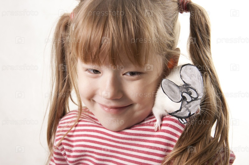 Маленькая девочка с мышкой на белом фоне