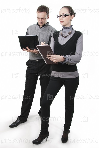 Женщина и мужчина в деловой одежде на белом фоне