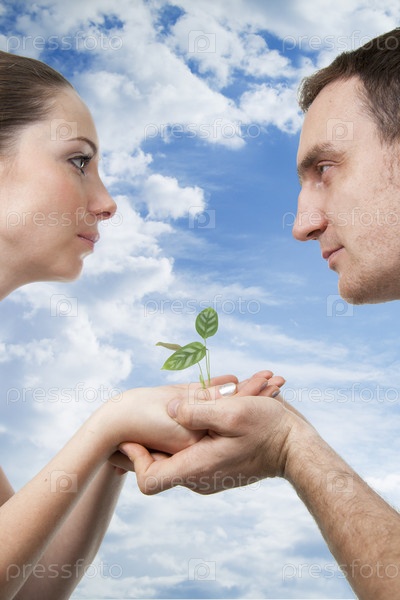 Мужчина и женщина, держащиеся за руки, в которых находится росток
