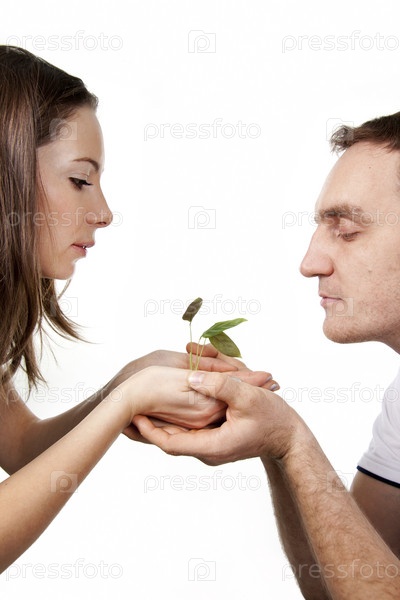 Мужчина и женщина, держащиеся за руки, в которых находится росток