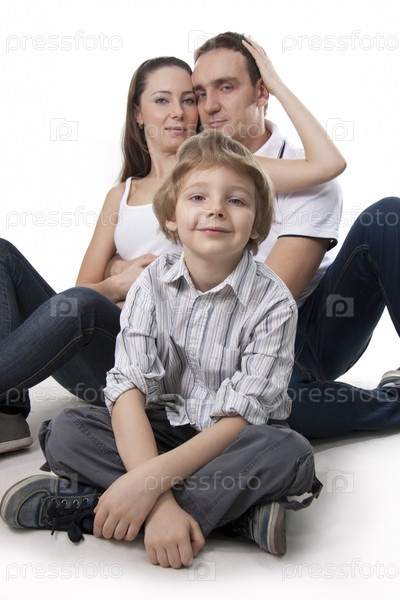 Счастливая молодая семья на белом фоне