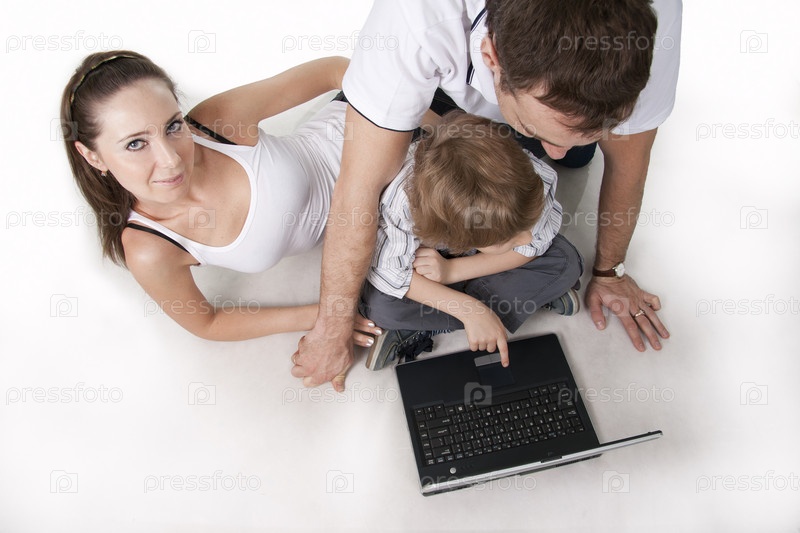 Счастливая молодая семья с ноутбуком на белом фоне