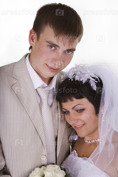 Молодые жених и невеста на белом фоне