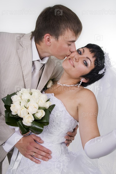 Молодые жених и невеста на белом фоне