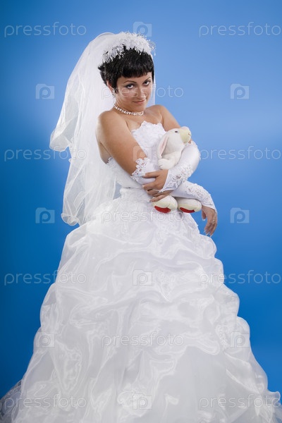 Красивая невеста с плюшевой игрушкой на синем фоне