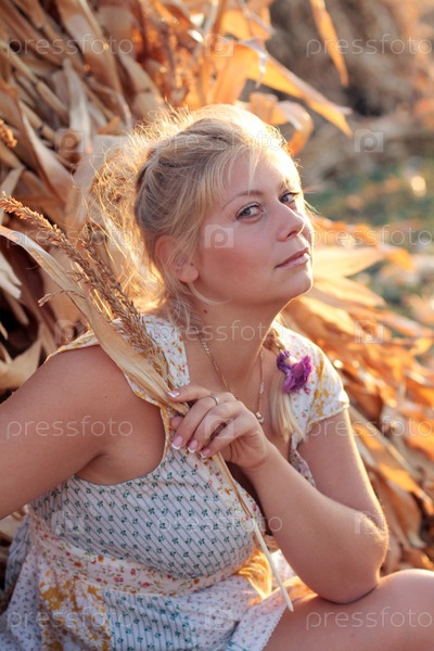 Молодая женщина в кукурузном стоге сена