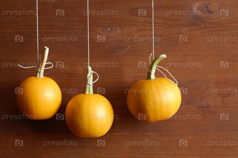 Три тыквы висят на веревках на деревянном фоне. Символ Хэллоуина