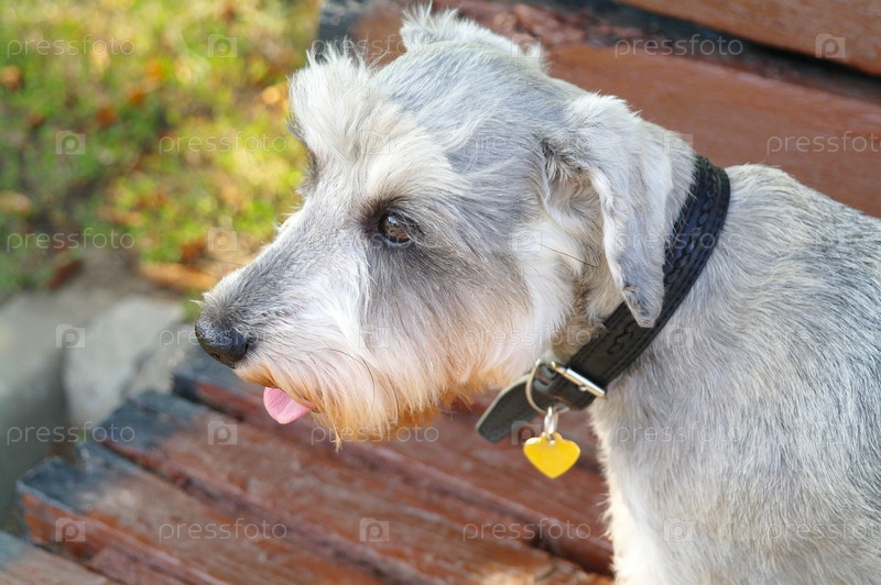 Портрет маленькой собаки цвергшнауцер на скамейке