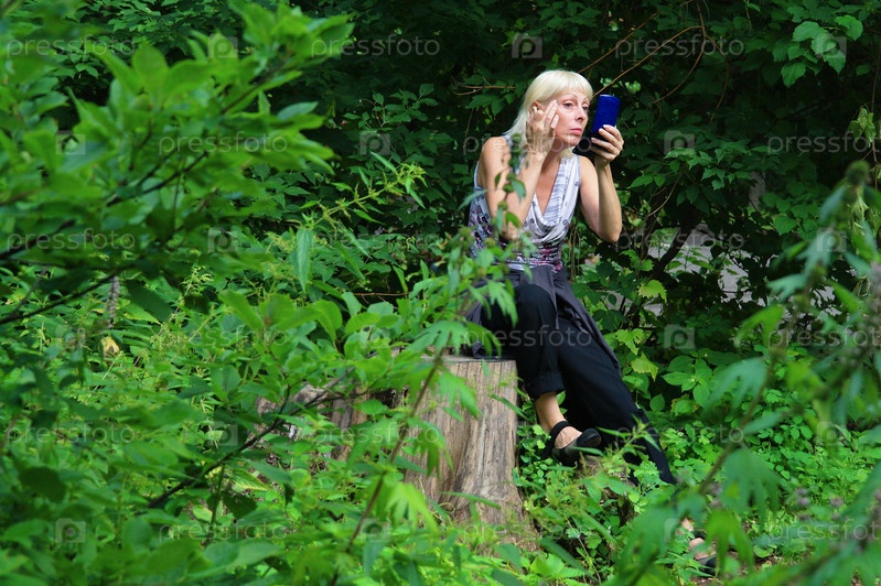 Женщина на большом пне делает макияж