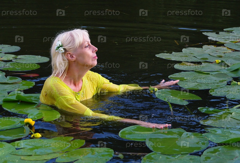 Женщина в желтой тунике купается в пруду с кувшинками