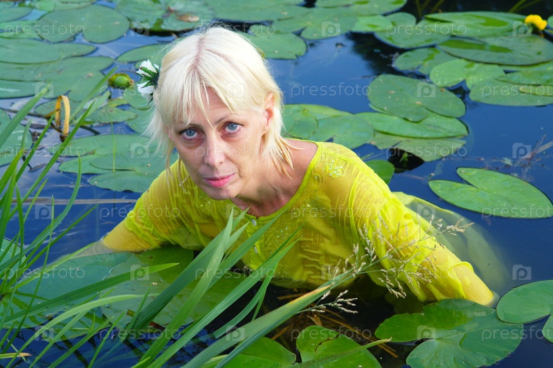 Женщина в желтой тунике купается в пруду с кувшинками