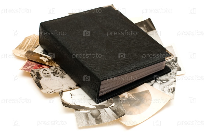 Куча винтажных фотографий и альбом на ней изолированы на белом