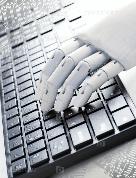 Деревянная рука печатает на клавиатуре компьютера, крупный план