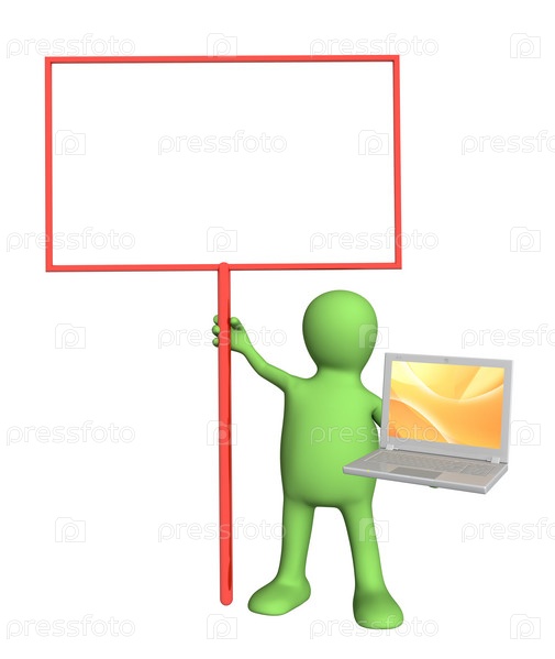 Человечек с пустым плакатом и ноутбуком
