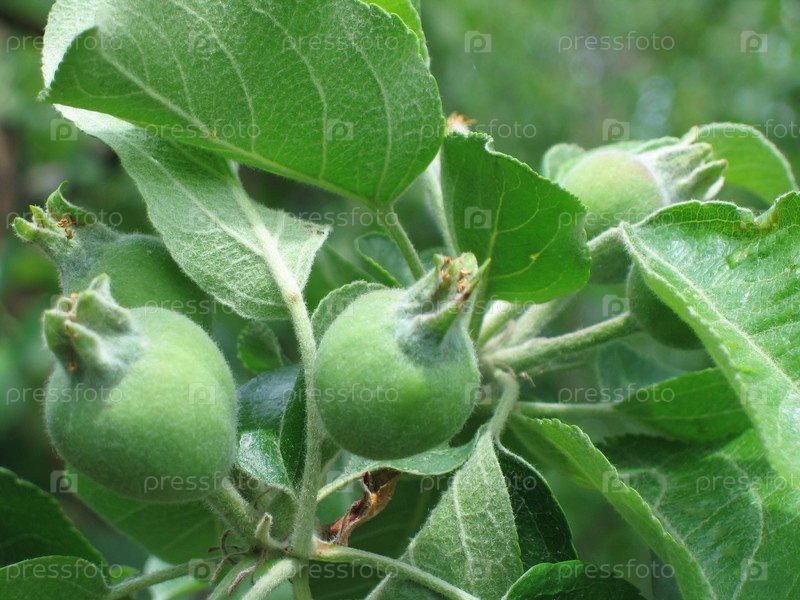Молодые зеленые яблоки на ветке. Крупный план