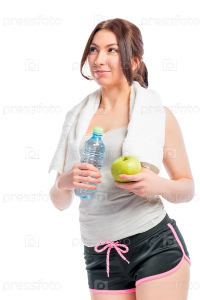 Девушка с яблоком и бутылкой воды