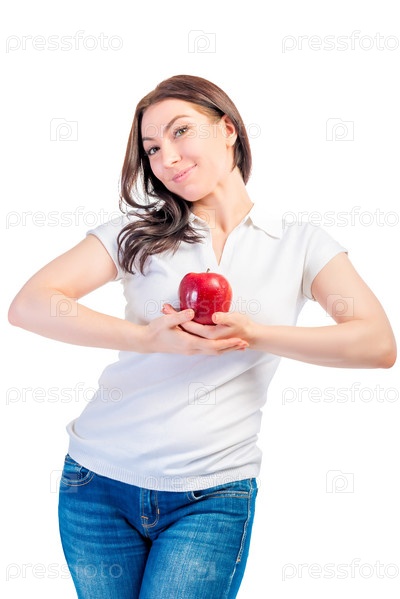 Девушка держит спелое яблоко