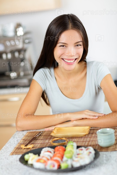 Женщина ест суши