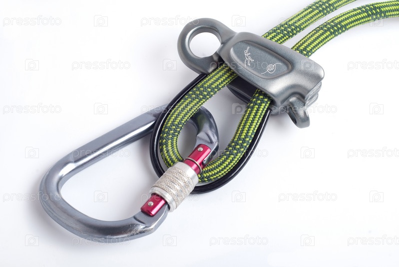Альпинистский карабин и веревка на белом фоне